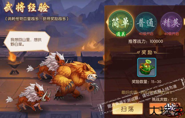 简单模式的武将经验日常副本,可以获得一定数量的中级经验酒。