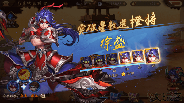 可以发现在我们进行打副本的时候,会有很多橙将碎片相送,只需要往前推几章副本,我们的碎片就积攒满了!就这样,徐盛到手!六人团队满足!