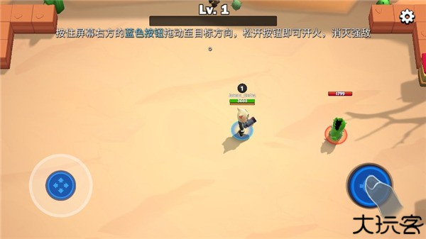 5、按住屏都右方的蓝色按钮拖动连目标方向,检开按钮即可开火,消灭强敌;