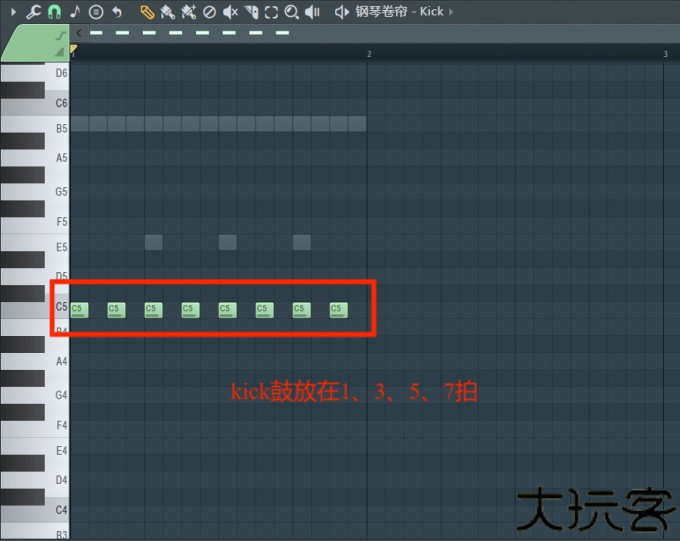 1、可以先从声部比较低的kick底鼓来编写,嘻哈音乐重视节奏感,而节奏感又主要通过鼓点来表达,所以在编写kick底鼓时可以编写在反拍位置,比如1、3、5、7拍,以此类推。