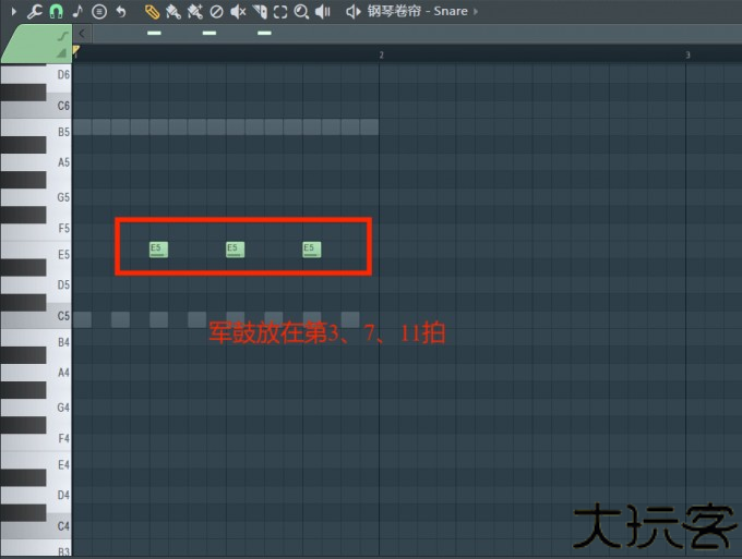2、接下来是中声部的军鼓,军鼓的打击感比kick底鼓更强,所以在编配军鼓鼓点时要做到“少而精”。太多的军鼓元素会分散音乐的重点,可以像编配kick底鼓一样,把军鼓放在第3、7、11拍的位置,每隔四拍安排一个军鼓,以此类推。