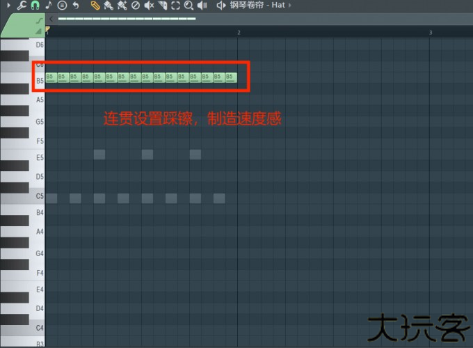 3、接下来是踩镲,嘻哈音乐除了鼓点之外,还需要表达出速度感,而踩镲就是速度感的关键。踩镲在嘻哈音乐中一定要保持连贯才能营造出速度感,配合嘻哈音乐较快的BPM,所以踩镲在每一拍都需要设置。