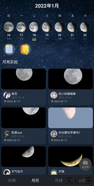 2、月历中,会出现每天的用户上传的各地拍摄到的月亮外形;