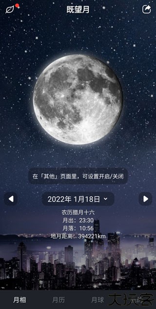 1、打开应用,首页即为今天的月亮样子,点击切换日期,即可查看每天的月亮外观;