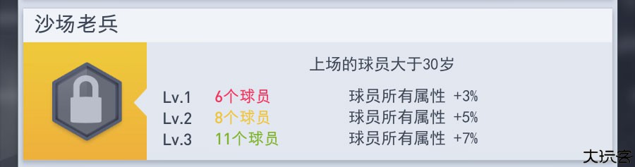 上场的球员大于30岁。6个球员:球员所有属性+3%;8个球员:球员所有属性+5%;11个球员:球员所有属性+7%。