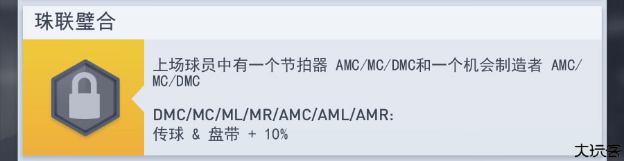 上场球员中有一个节拍器AMC/MC/DMC和一个机会制造者AMC/MC/DMC。DMC/MC/ML/MR/AMC/AML/AMR:传球和盘带+10%。