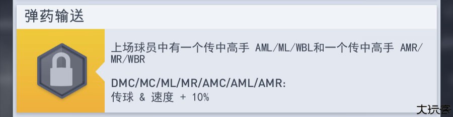 上场球员中有一个传中高手AML/ML/WBL和一个传中高手AMR/MR/WBR。DMC/MC/ML/MR/AMC/AML/AMR:传球和速度+10%。