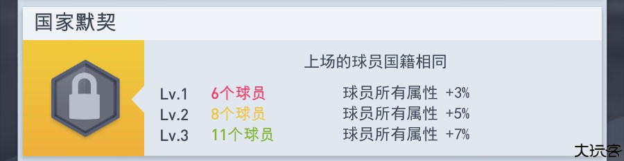 上场的球员国籍相同。6个球员:球员所有属性+3%;8个球员:球员所有属性+5%;11个球员:球员所有属性+7%。