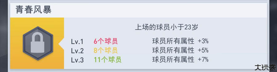 上场的球员小于23岁。6个球员:球员所有属性+3%;8个球员:球员所有属性+5%;11个球员:球员所有属性+7%。