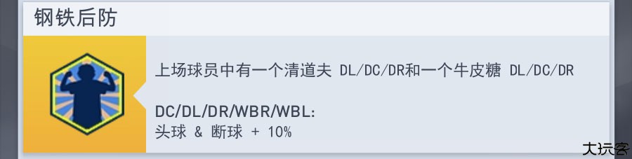 上场球员中有一个清道夫DL/DC/DR和一一个牛皮糖DL/DC/DR。DC/DL/DR/WBR/WBL:头球和断球+10%。