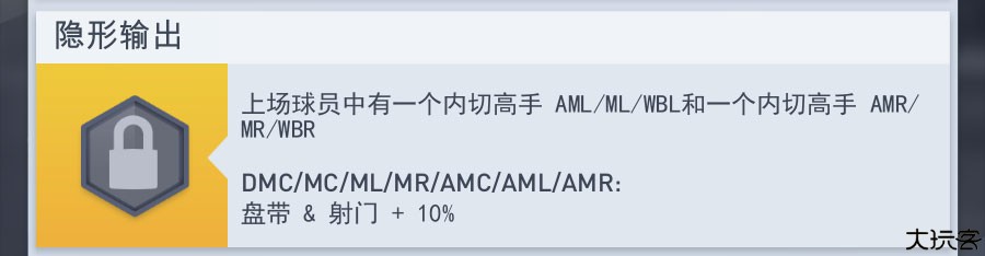 上场球员中有一个内切高手AML/ML/WBL和一个内切高手AMR/MR/WBR。DMC/MC/ML/MR/AMC/AML/AMR:盘带和射门+10%。