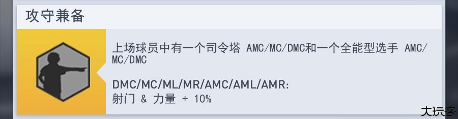 上场球员中有一个司令塔AMC/MC/DMC和一个全能型选手AMC/MC/DMC。DMC/MC/ML/MR/AMC/AML/AMR:射门和力量+10%。