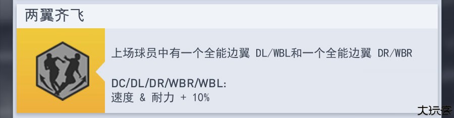 上场球员中有一个全能边翼DL/WBL和一个全能边翼DR/WBR。DC/DL/DR/WBR/WBL:速度和耐力+10%。