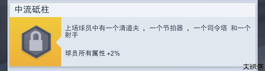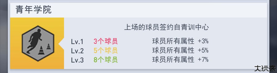 上场的球员签约自青训中心。3个球员:球员所有属性+3%;5个球员:球员所有属性+5%;8个球员:球员所有属性+7%。