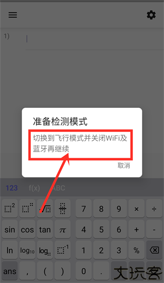 出现的对话框要求您切换到飞行模式。启动飞行模式后,手机将无法收/发外界信号。这样可以确保您的设备已锁定为科学计算器检测模式,并且在取消飞行模式前不允许访问其他任何内容。