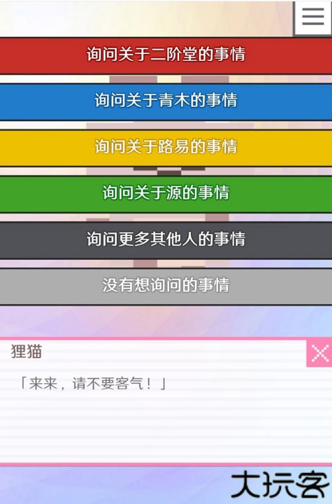 另外如果想要对角色有更深的了解的话,可以在好感为“普通”的情况下(差的时候看运气,可能会直接看到崩坏立绘)(“普通”就是说不能每次都扣好感或者每次都加好感,比较直观的评判标准是像素的进展落后于剧情)点这些角色的剧情,会触发一些高好感度不会触发的剧情(有助于更好地了解人物呢),比如二阶堂的梅雨剧情和青木的拿书剧情等(如下图)。