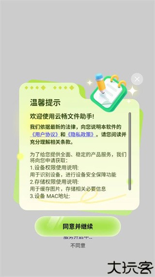 1、在本站下载云畅文件助手,一键下载并安装,查看温馨提示后点击同意并继续。