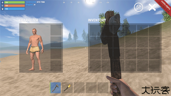 2、点击右上角背包可以打开背包,同时可以查看制造和可制造列表,以及你的穿装信息,我们可以用手指拖动将背包里的东西拖到屏幕正下方的腰带上,点击不同的物品来切换腰带上的激活物品,以便使用物品。