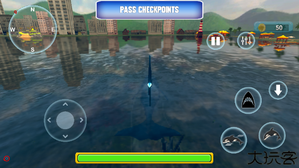 2、可以发起突袭,掠食鱼类和游泳者,体验鲨鱼的野性和力量。