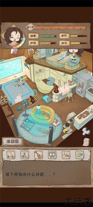 3、当健康 舒适 娱乐变绿,数值很高,且疲惫为零甚至,从黄条变成绿条的时候,主角综合效果到最好水平,也就是左上角彩色血条到蓝色,心情最好(结局的花花也会开)。