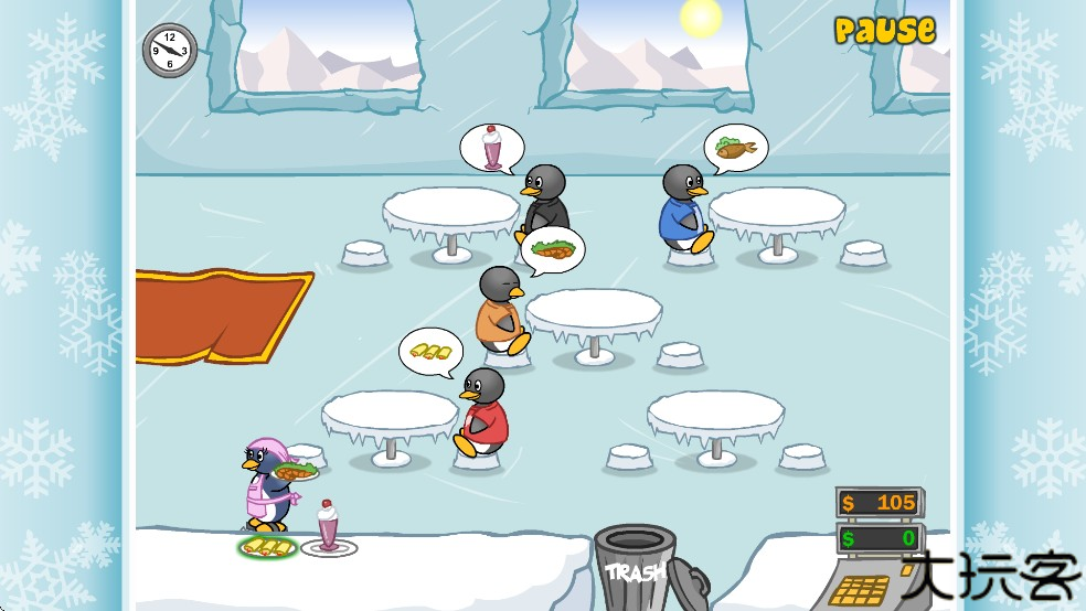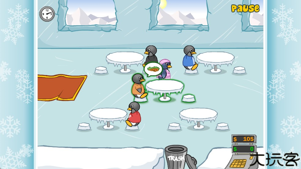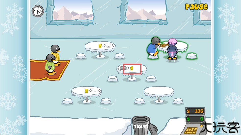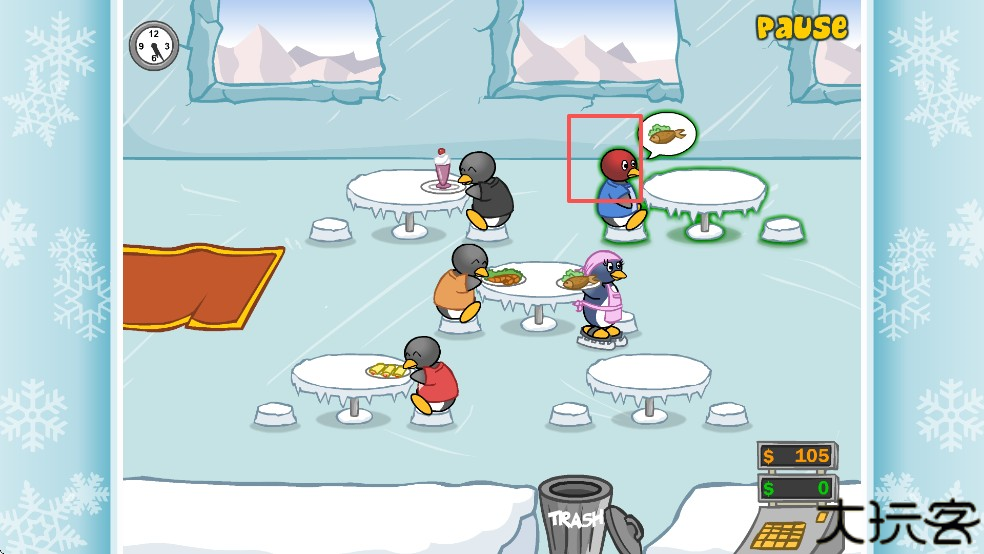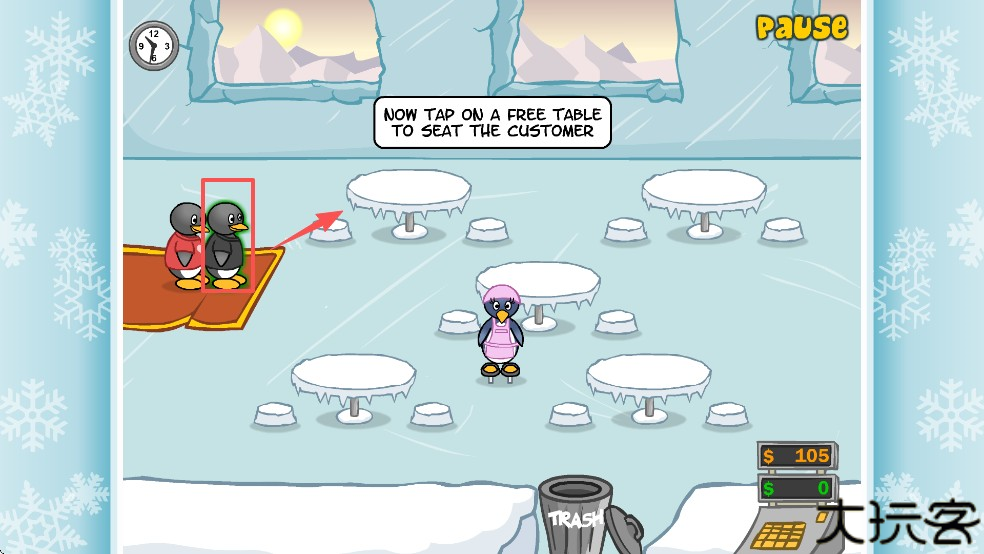 3、进入游戏后,将企鹅顾客分配到空桌上