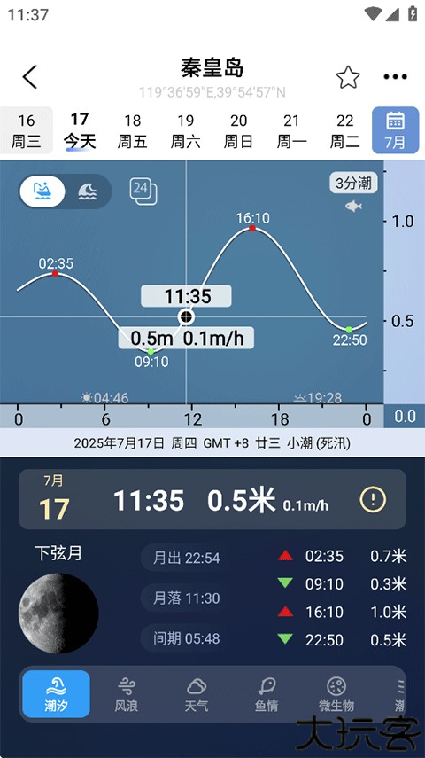 实时显示当前及未来潮汐曲线、浪高和月相信息。