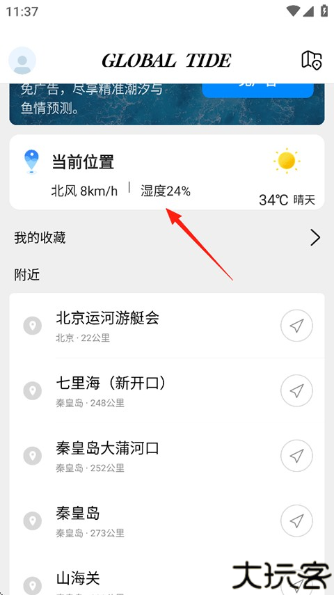 1、打开全球潮汐APP,在首页先定位你所在的位置或想要了解的位置。