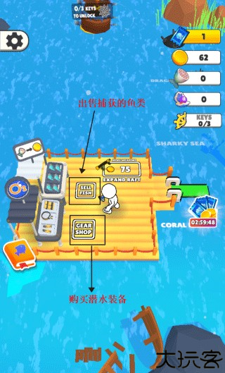 4、当潜水时间到达上限,回到展台时,可以出售捕获的鱼类,换取货币,交换购买潜水道具。