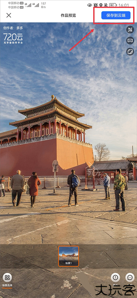 5、最后就可以预览制作完成后的全景图作品啦,然后点击保存到云端后就制作完成啦