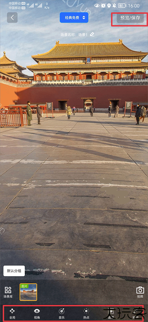4、创建完成后可以为创建的全景图进行全局设置、视角设置、音乐、热点、特效的添加等来完善化全景图,制作完成后点击右上角预览/保存