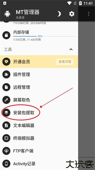 1、进入软件后,点击左上角选项并点击安装包提取;