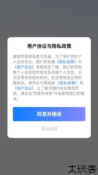 1、打开APP在弹框页面中点击同意并继续即可进入下一页。