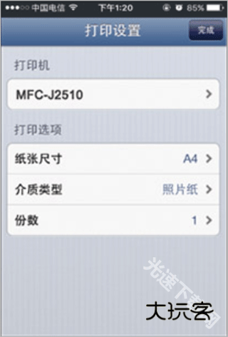 3、选择打印机并确定纸张的尺寸、纸张类型、打印页数,然后点击完成;
