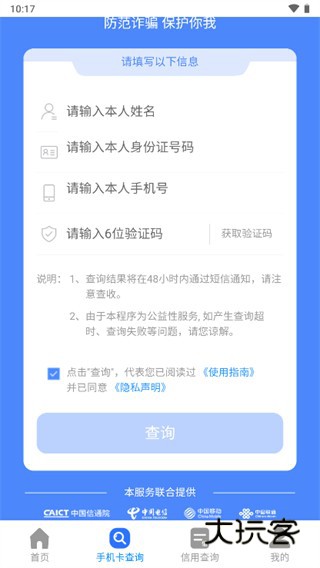 3、点击“手机卡查询”可输入自己身份证、姓名、手机号,并获取验证码就能够查询自己名下所办理的卡号数量。并且结果会在48小时的时间内通过短信的方式发送到你的手机号中。