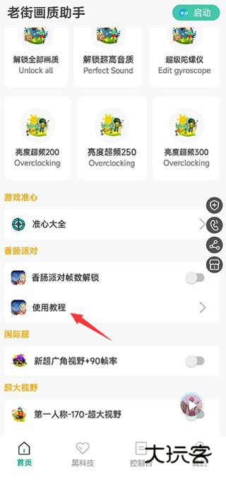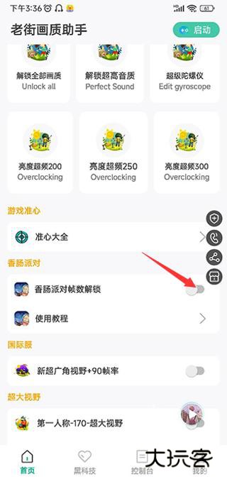 1、下载安装香肠派对画质助手120帧官方正版,运行软件,在首页,找到香肠派对帧数解锁;
