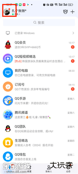 1、首先打开QQ软件,进入到首页中后可以看到最近联系的好友,在这里点击左上角的【头像】;