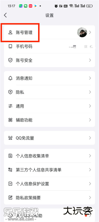3、接着来到设置的页面中有账号管理、手机号、账号安全登功能,我们点击【账号管理】;