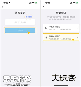 2、输入需要找回密码的QQ号/邮箱后点击【下一步】,在身份验证页面,点击【资料辅助验证】;
