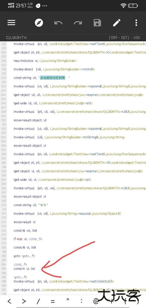 4、点击搜索到的*下面这个,往下翻到1285行,把const/4v1.0x0改成const/4v1.0x1