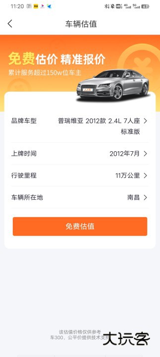 2、输入自己爱车的车型,上牌时间、行驶里程等等信息,点击免费估值;