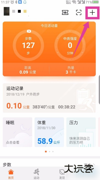 第一步,点击并打开运动健康软件,接着点击页面右上角的“+”号