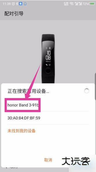 第五步,在配对过程中,我们必须要保持蓝牙的开启,在下图所示的配对引导页面中,点击搜索到的手环