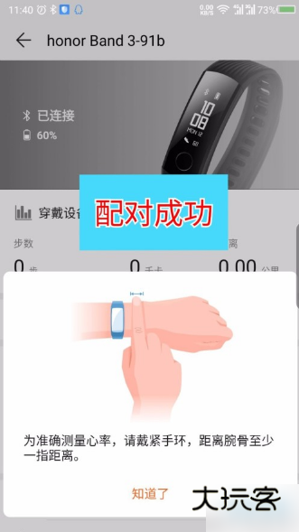 第七步,再次来到手环主页面后,我们可以在这一页面设置手环的功能,点击页面底部的知道了选项,就成功在运动健康软件中连接了手环手表