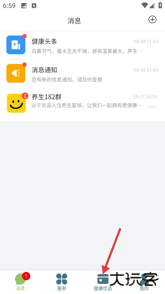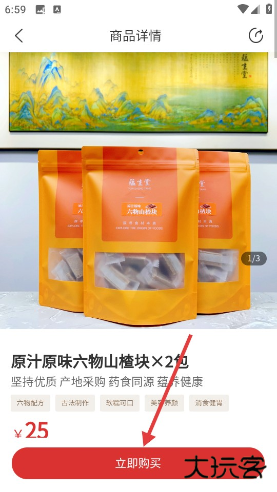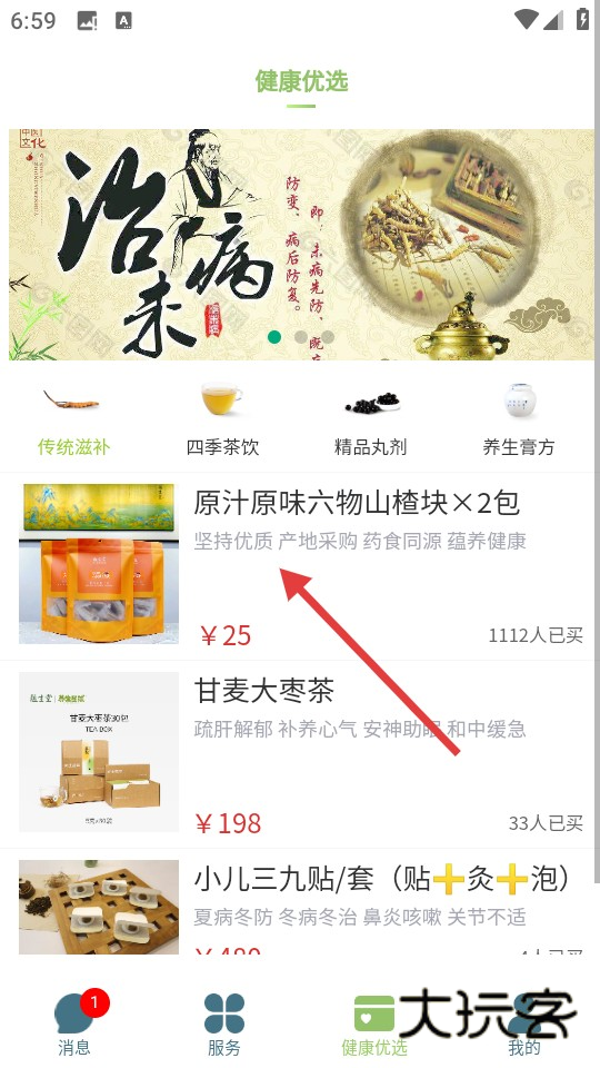 2、进入【健康优选】页面,可选择感兴趣的养生商品,如“原汁原味六物山楂块”。