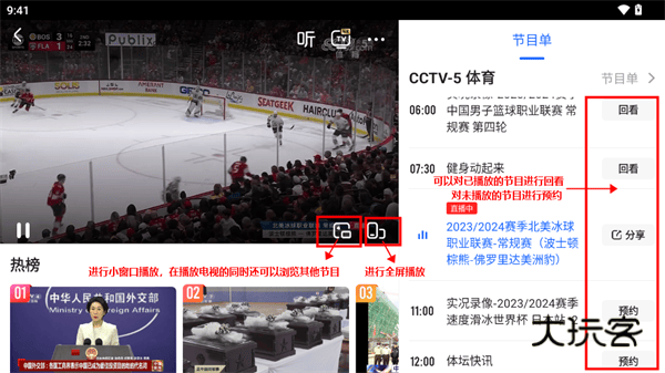 4、点击节目单,可以在页面进行回放和预约功能,页面还支持小窗口播放和全屏播放
