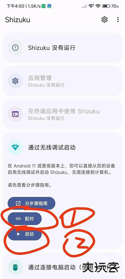 2、打开shizuku,按照步骤配对,配对完成后,点启动。