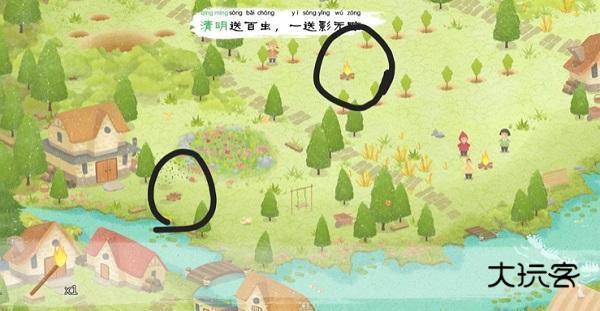8、点小孩手里的木棍(有点小,放大看),把木棍放进河对岸的火里,再把木棍给小孩(还有三处火堆场所如图)然后让我们视线归来右上角的茶伯伯这里。