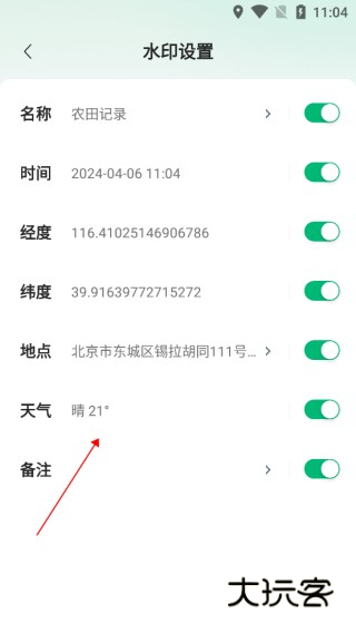 3、可选择需要的要素使用,名称、时间、经度、纬度、地点、天气或是添加备注
