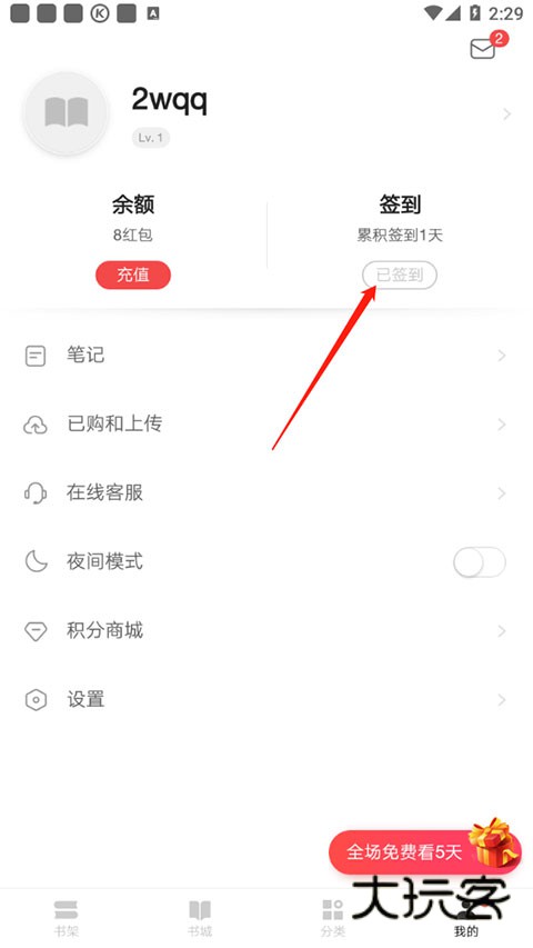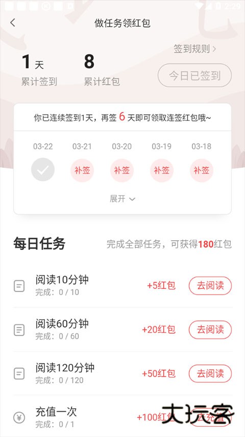 5、在这可以看到主页面提示我们得到的阅读点了。