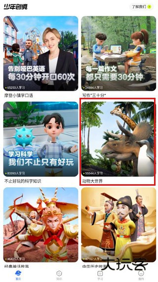 1、玩家进入首页可以看到有很多种类的课程,选择一门进入,以动物大世界为例